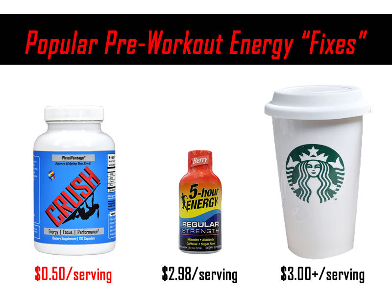 At less than 50 cents per serving CRUSH is cheaper than an energy drink, coffee, 5-Hour Energy, or similar...and also far more effective for creating an optimal physical and mental state for peak performance.