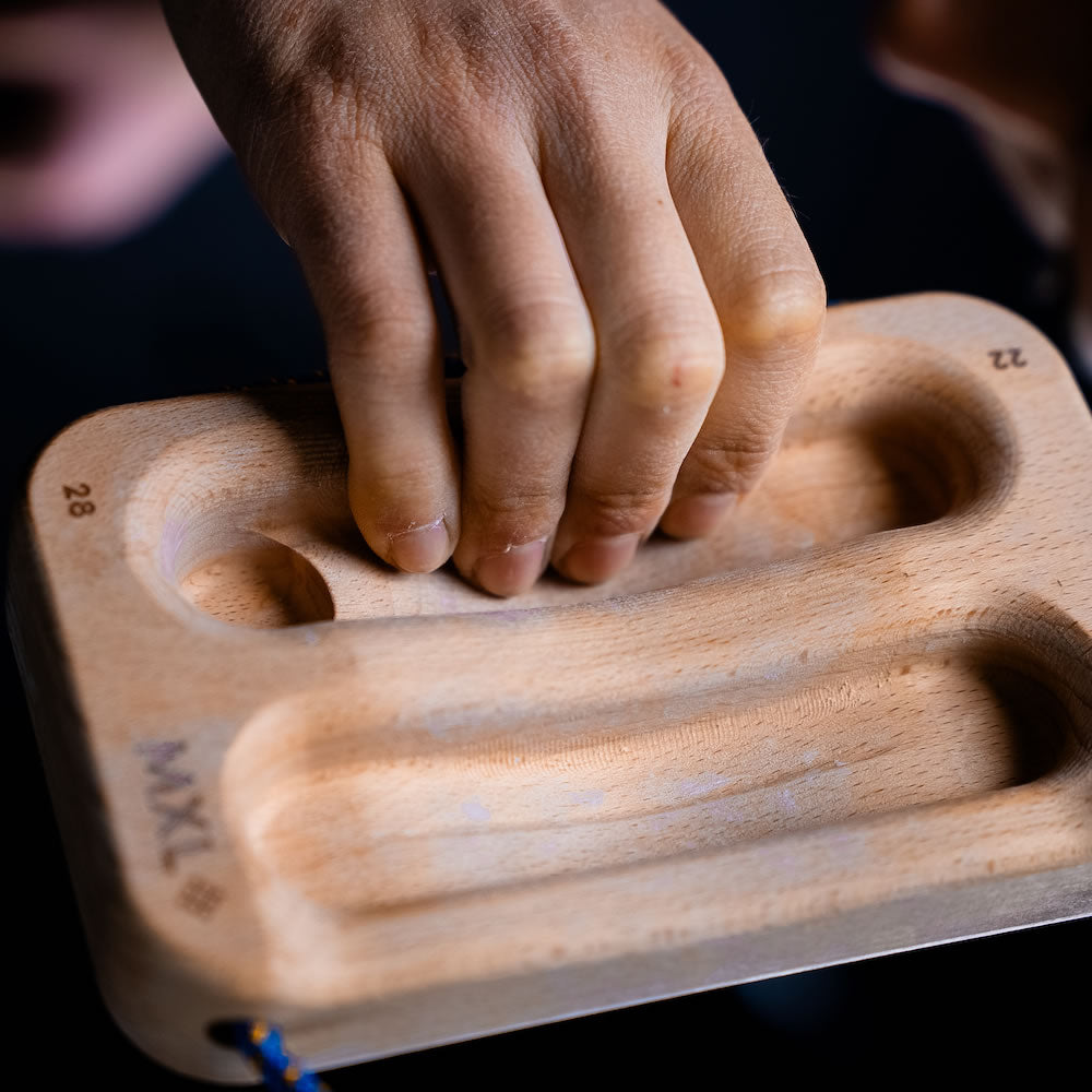 Choose the edge that suits you: your morphology, your preferences, and your goals! This is particularly relevant for athletes with larger hands, who often find the standard 18-20mm edge on a hangboard too shallow to support and load the full length of their fingertip. VIEW SIZE GUIDE HERE (pdf) >>