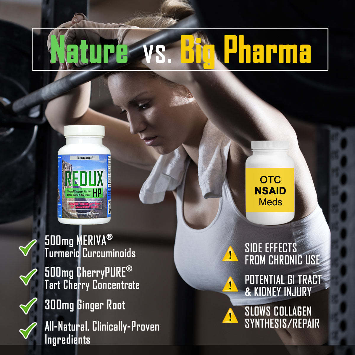 REDUX HP combines three clinically studied all-natural ingredients into a potent and peerless supplement for addressing the common aches/pains of rigorous exercise, accelerating recovery, and supporting performance.